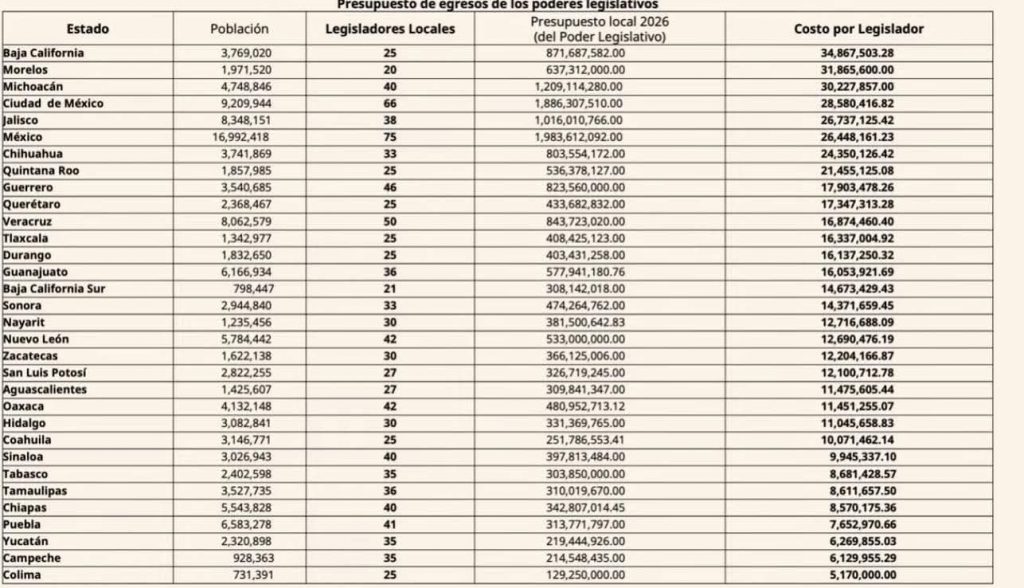 El dato que circula en redes sociales es contundente: cada diputado local “cuesta” más de 17 millones de pesos al año, lo que equivale a más de 47 mil pesos diarios por legislador. La cifra surge de dividir el presupuesto total del Poder Legislativo estatal —más de 433 millones de pesos para 2026— entre los 25 diputados que integran el Congreso.
