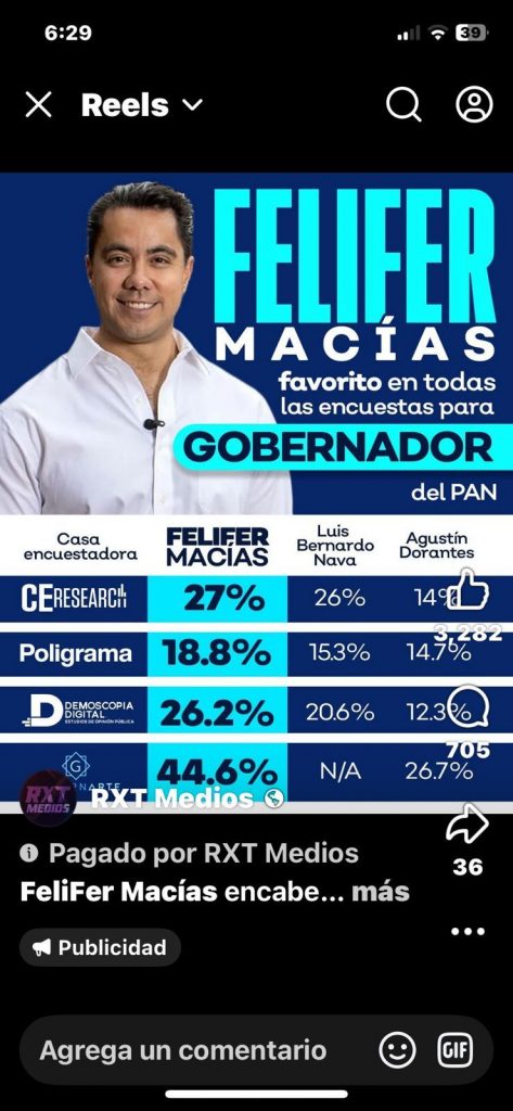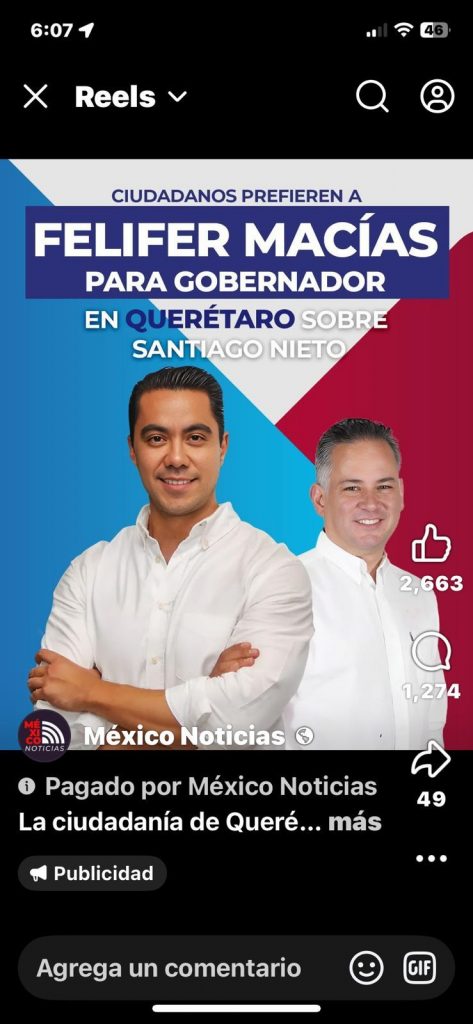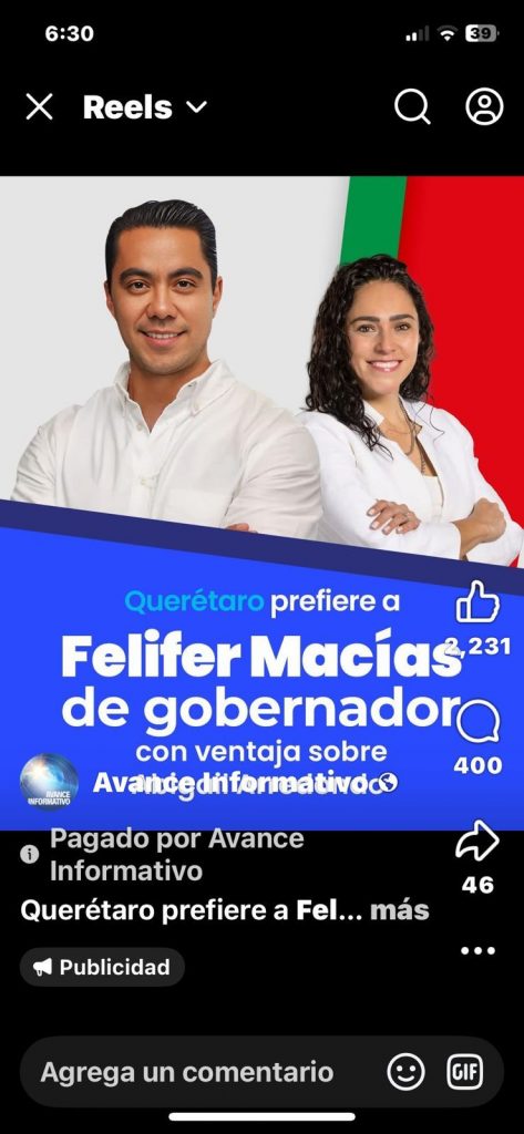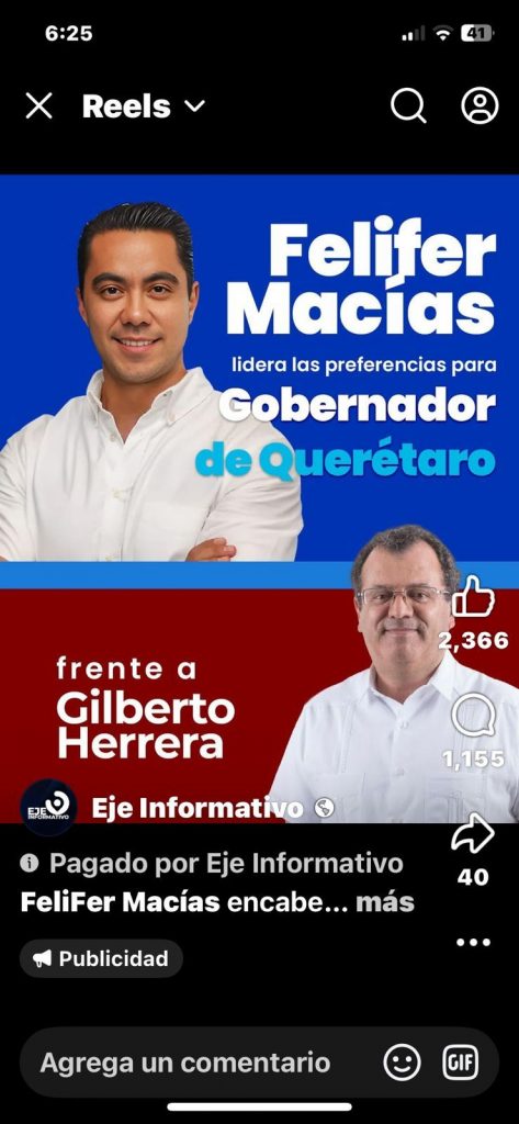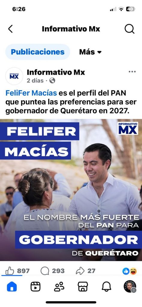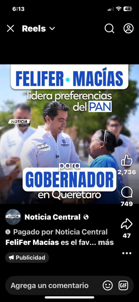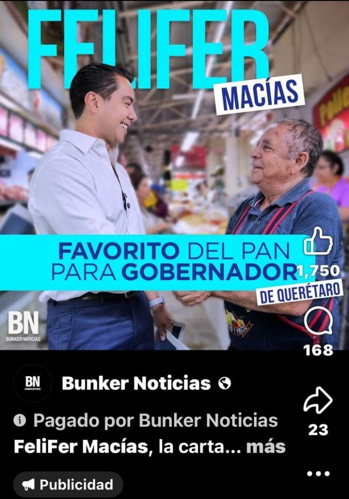 En las últimas semanas, una serie de anuncios pautados desde múltiples cuentas de Facebook ha inundado el estado de Querétaro. Al menos seis campañas digitales, con un costo estimado de 300 mil pesos, han sido destinadas exclusivamente al posicionamiento político de Felifer Macías, servidor público en activo. No se trata de información institucional ni de rendición de cuentas: es promoción personalizada, diseñada para fijar nombre, rostro y narrativa.