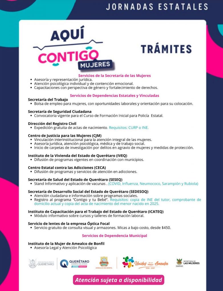 La jornada tiene como objetivo fortalecer el bienestar, la salud y el desarrollo integral de las mujeres amealcenses a través de atención especializada, talleres informativos, asesorías y actividades de empoderamiento. Entre los servicios contemplados se incluyen orientación jurídica, atención psicológica, información sobre prevención de la violencia, salud reproductiva y programas sociales disponibles a nivel estatal.